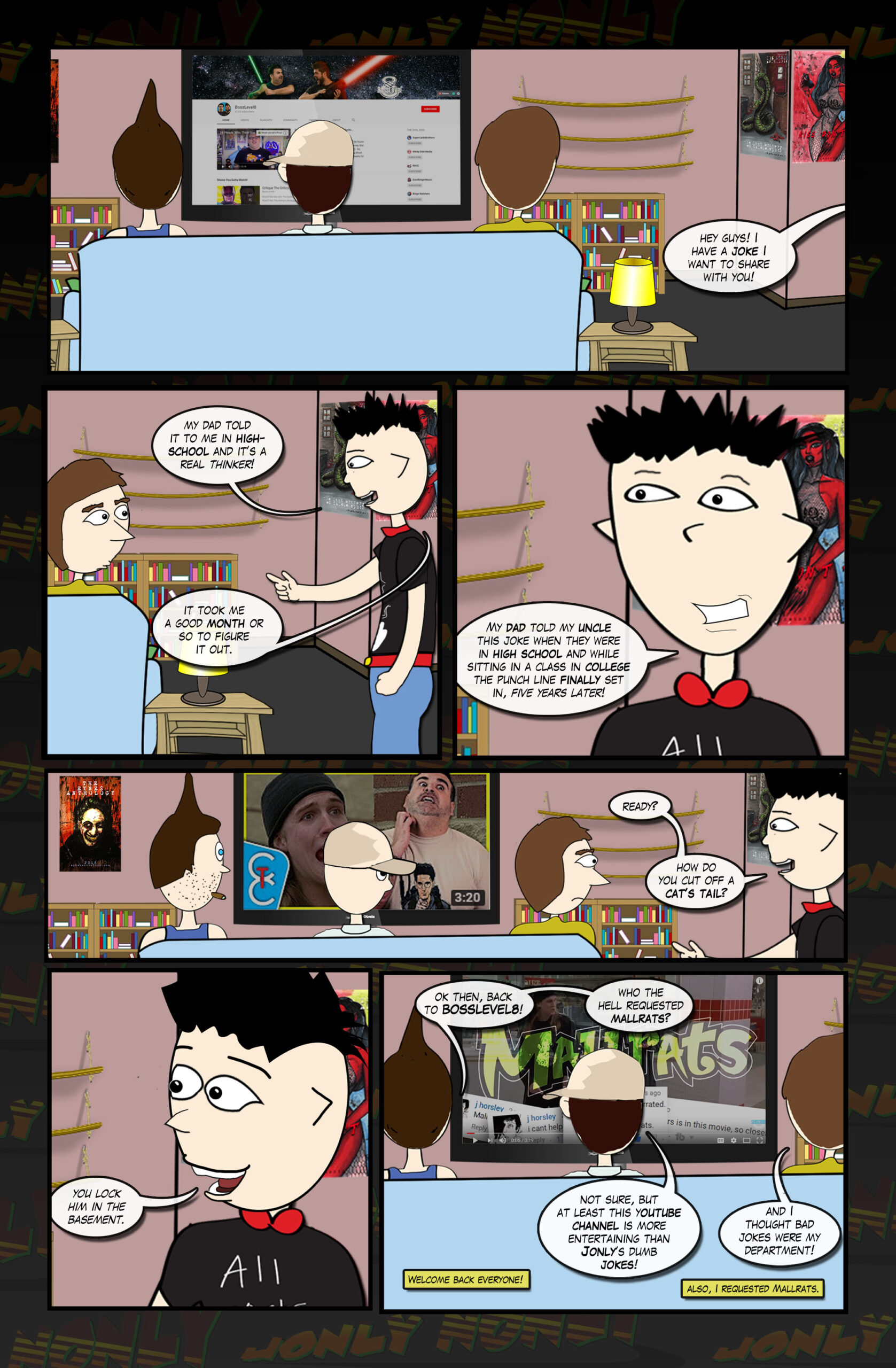 I was going to link to the Mallrats video from BossLevel8 that is referenced in this comic page...only it appears that it was taken down. So I guess I'll just link to their main page (As of writing this they have not released a video in 5 years and that makes me sad)