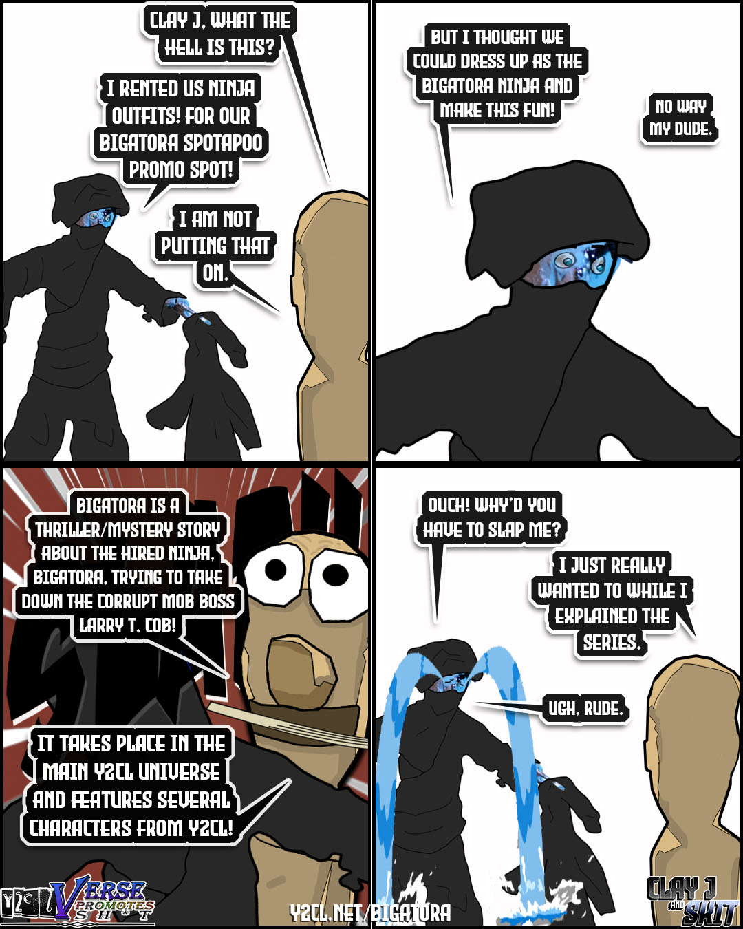 Bigatora is a thriller/mystery story about the hired Ninja, Bigatora, trying to take down the corrupt mob boss Larry T. Cob!