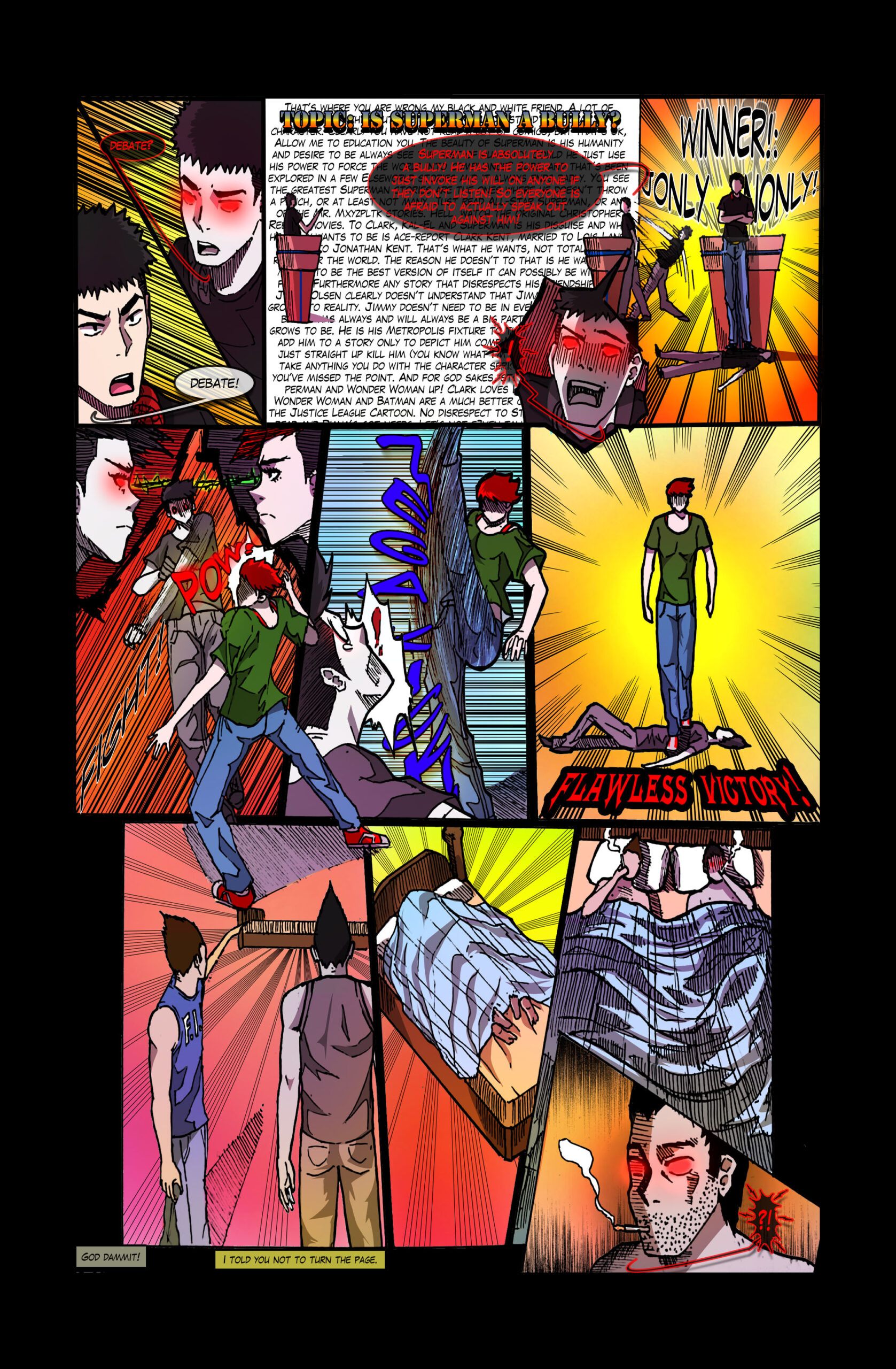 Jonly and Evil Jonly engaged in a debate. Panels 1 they are in deep debate. Panel 2 Evil Jonly is taking a step back. Panel 3 Jonly is standing over Evil Jonly that is dead on the floor.