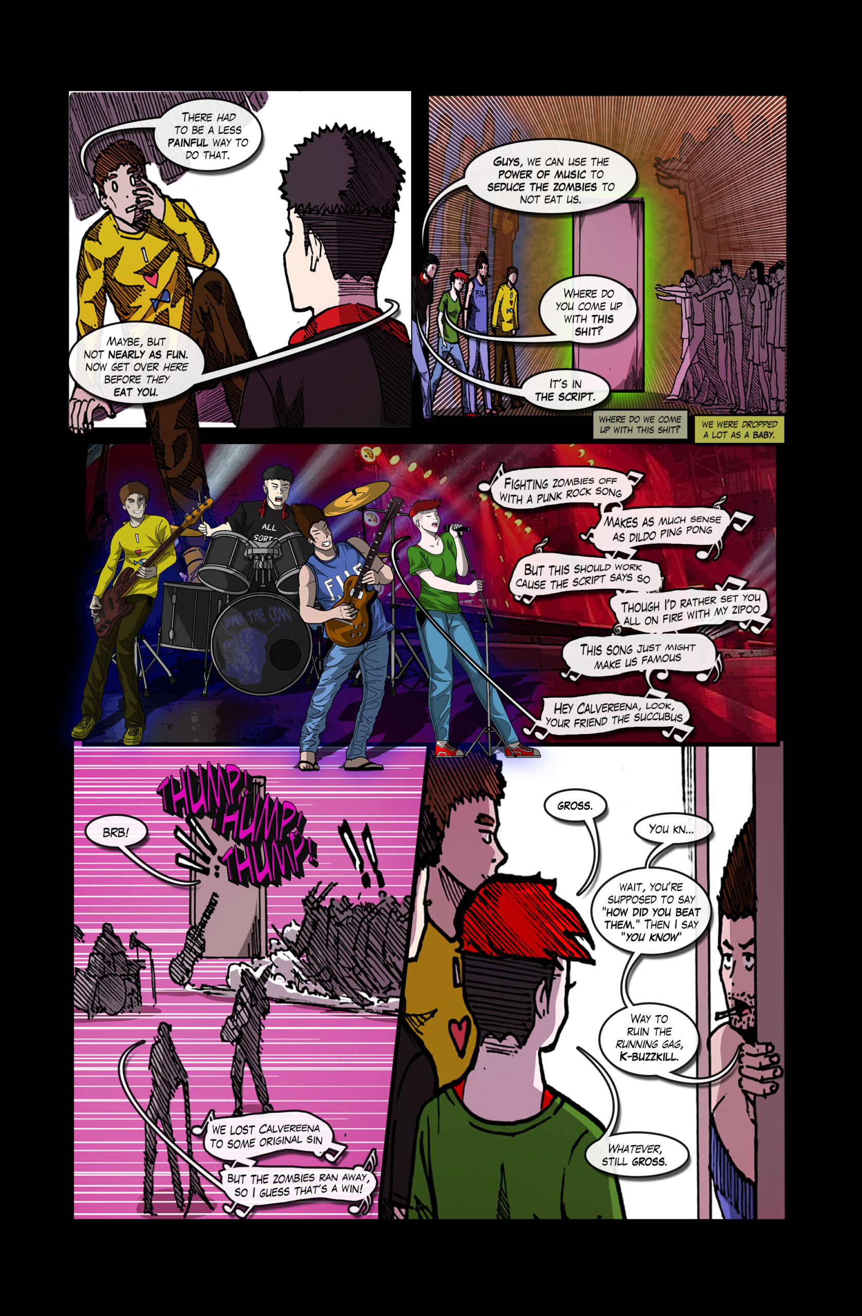 Same as panel 3, Calvereena is gone, his bass guitar floating in air. The zombies are fleeing and running away. There is a door with thumping coming from it.