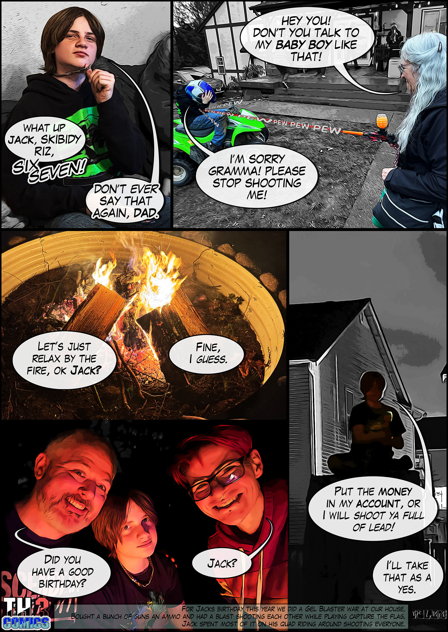 We went with gel blaster guns this year for his party and it was pretty awesome. Minimal injuries, maximum fun. As I noted in the comic, Jack spent most of the time riding his quad around and shooting people, stopping and hopping off to use his quad as a shield, then shooting more people.