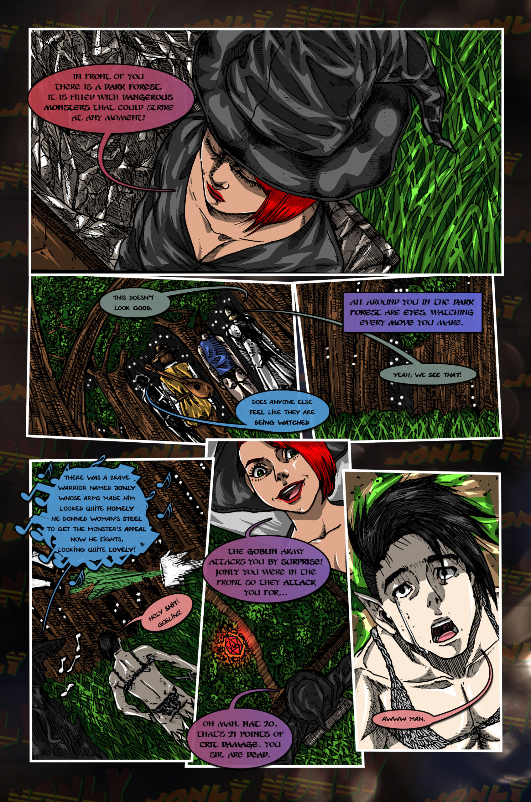 Jeffers (a bard), Earf (a paladin) Calvereena (a barbarian, his sword is attached at his waist like a giant penis) and Jonly (a warrior maiden in bikini armor) stand at the entrance of a dark and spooky forest. There is a sign somewhere that's old and breaking that says "The Dark Forest of Schnea"
