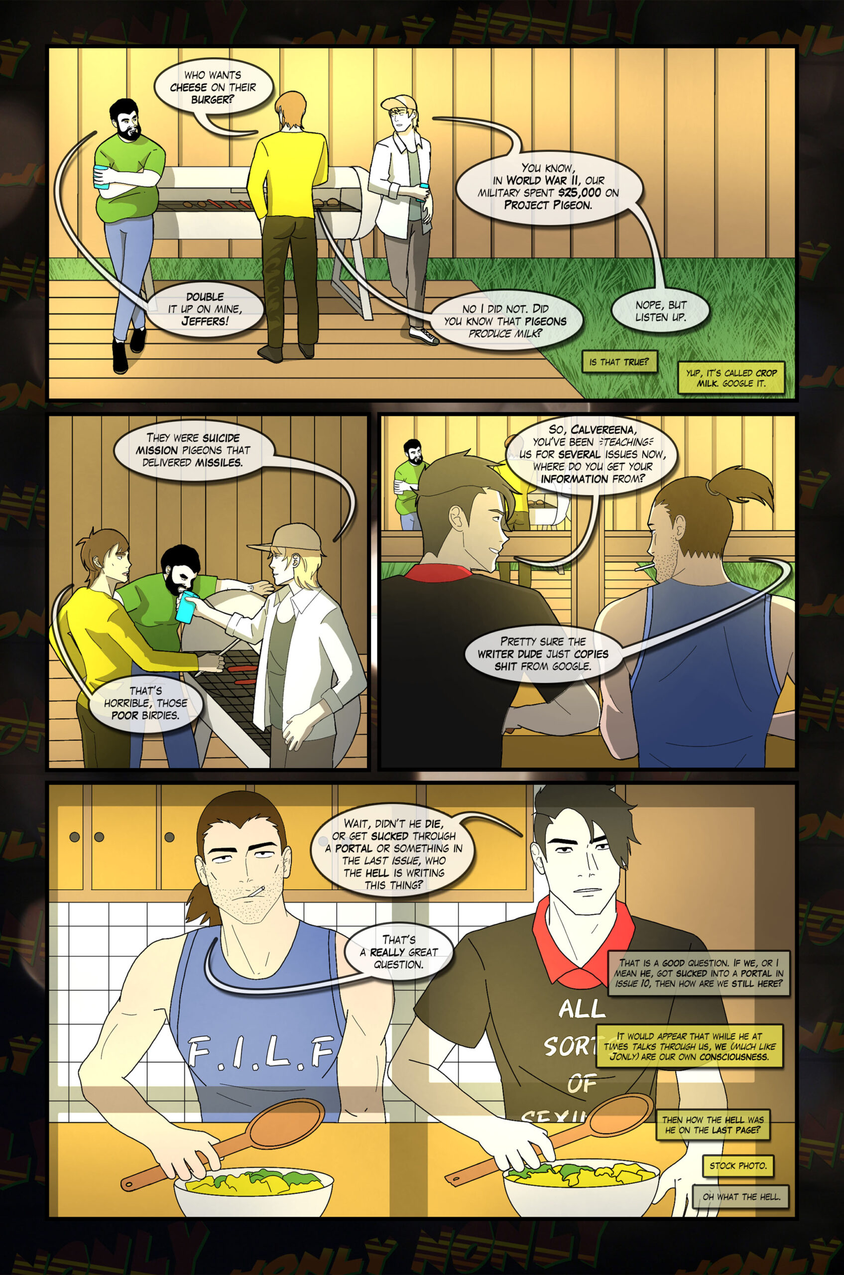 Earf looking over at Jeffers while he grills, tipping his drink at him like he's using it to make a point. Alberto is fixated on the grill.