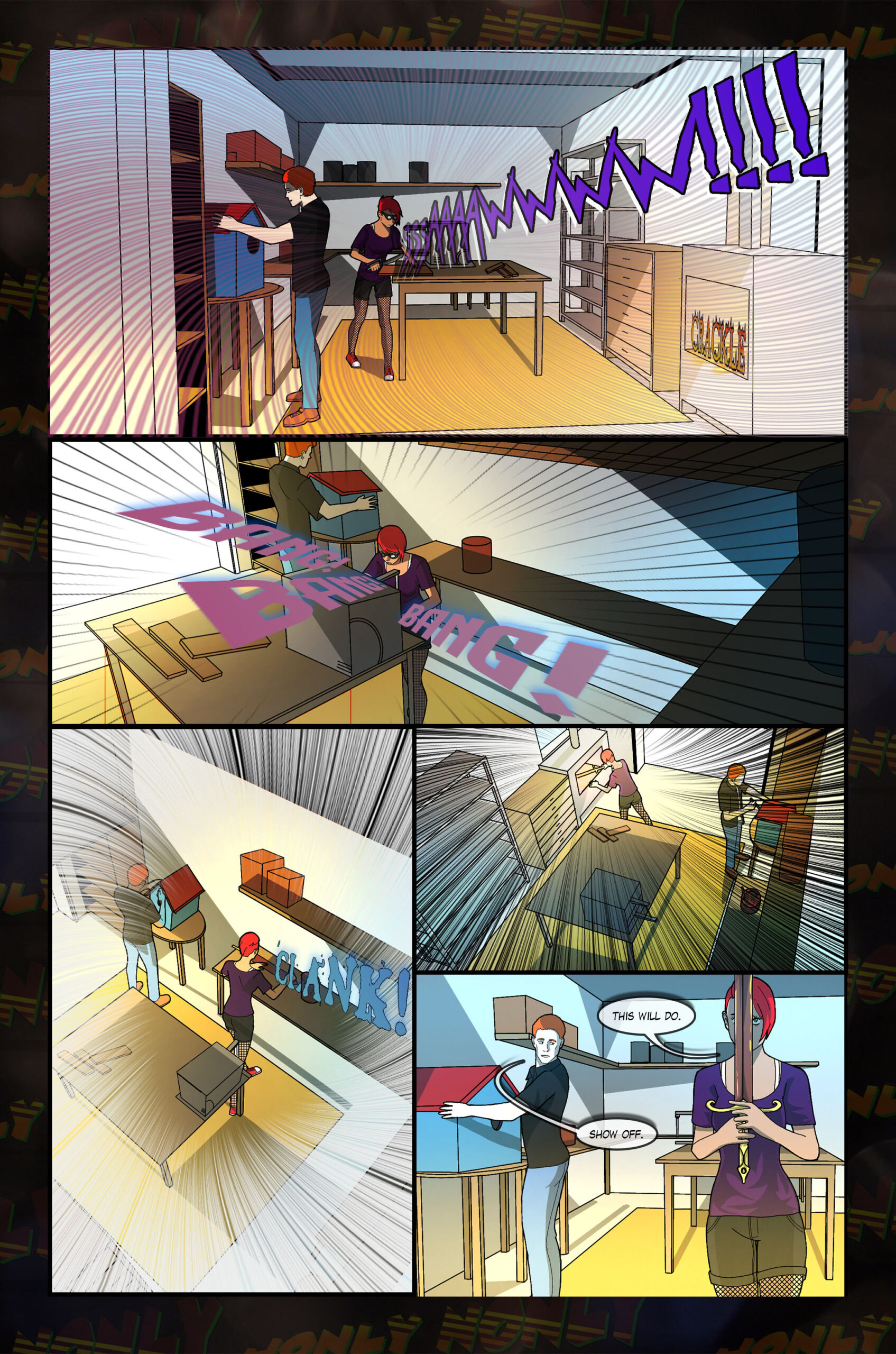 K-dizzle holding the sword in a power stance with a smirk on her face. Garmy looking over at her from his bird house.