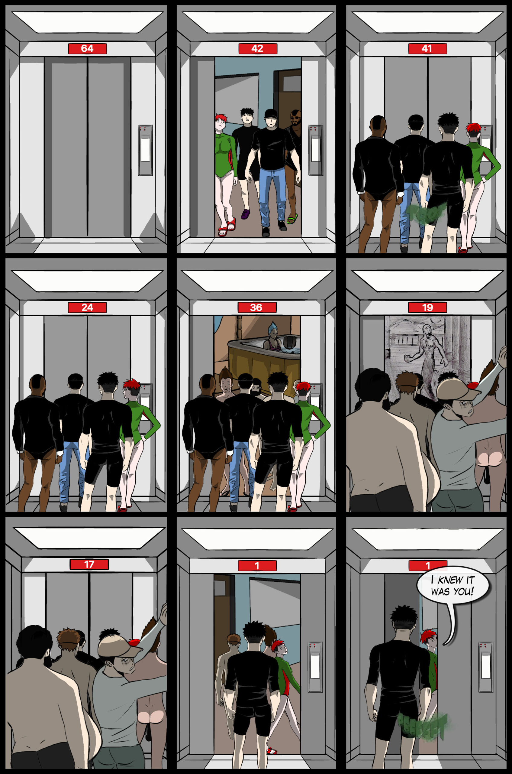 Inside Elevator, we see everyones backs. The doors open again, we see Calvereena, Earf, Alberto, and Jeffers standing there. The floor reads 24.