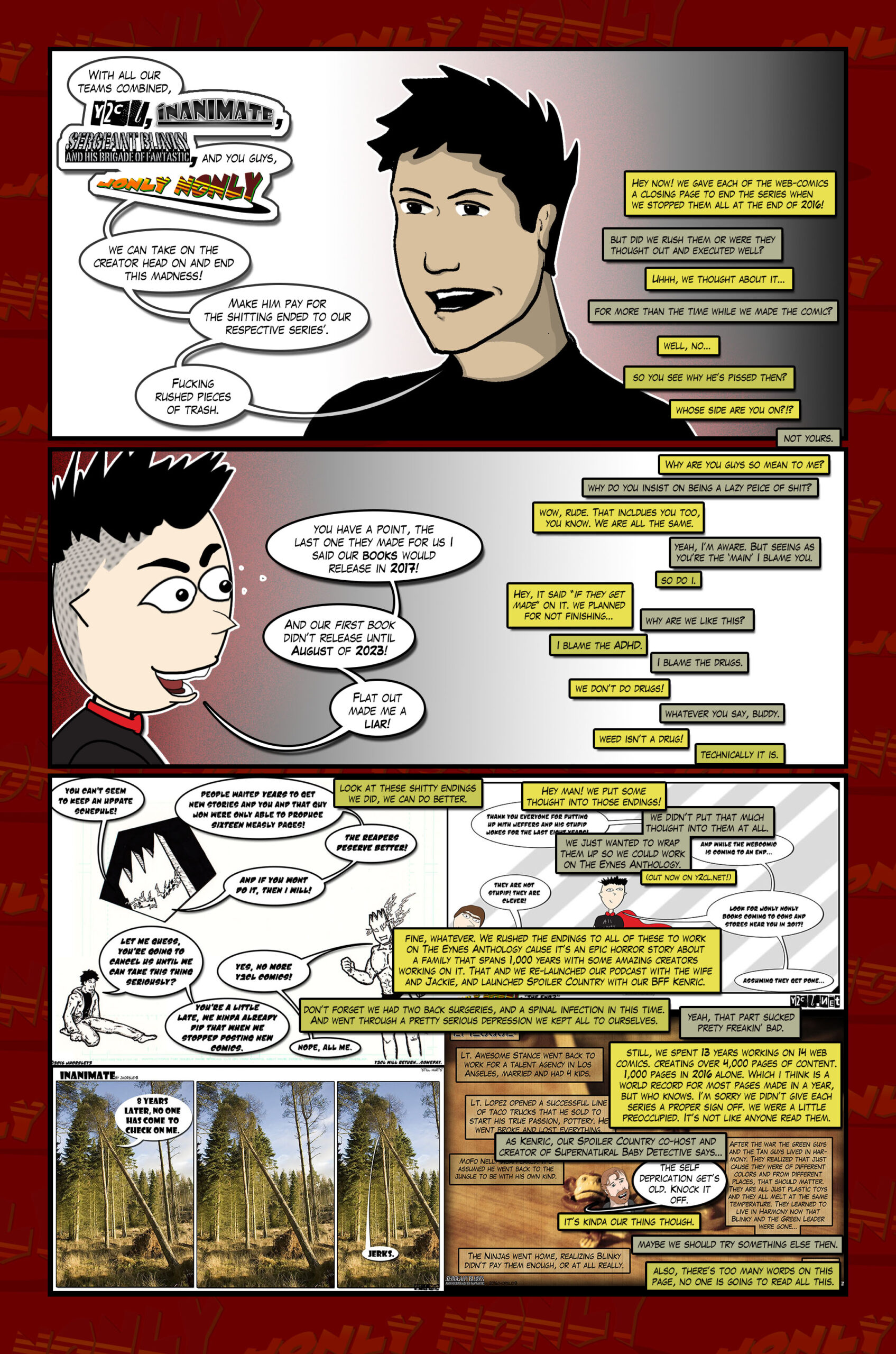Fine, whatever. We rushed the endings to all of these to work on The Eynes Anthology cause it's an epic horror story about a family that spans 1,000 years with some amazing creators working on it. That, and we re-launched our podcast with the wife and Jackie, and launched Spoiler Country with our BFF Kenris.