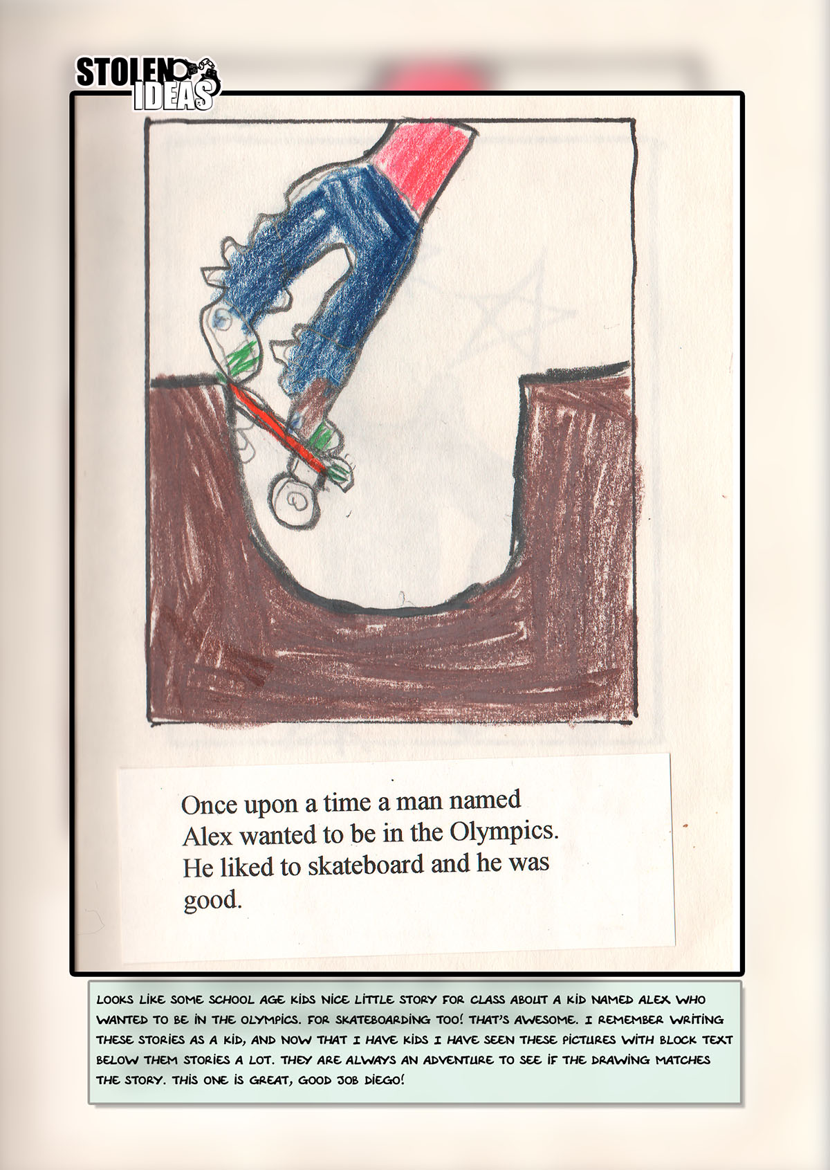 Looks like some school age kids nice little story for class about a kid named Alex who wanted to be in the Olympics. For skateboarding too! That's awesome. I remember writing these stories as a kid, and now that I have kids I have seen these pictures with block text below them stories a lot. They are always an adventure to see if the drawing matches the story. This one is great, good job Diego!