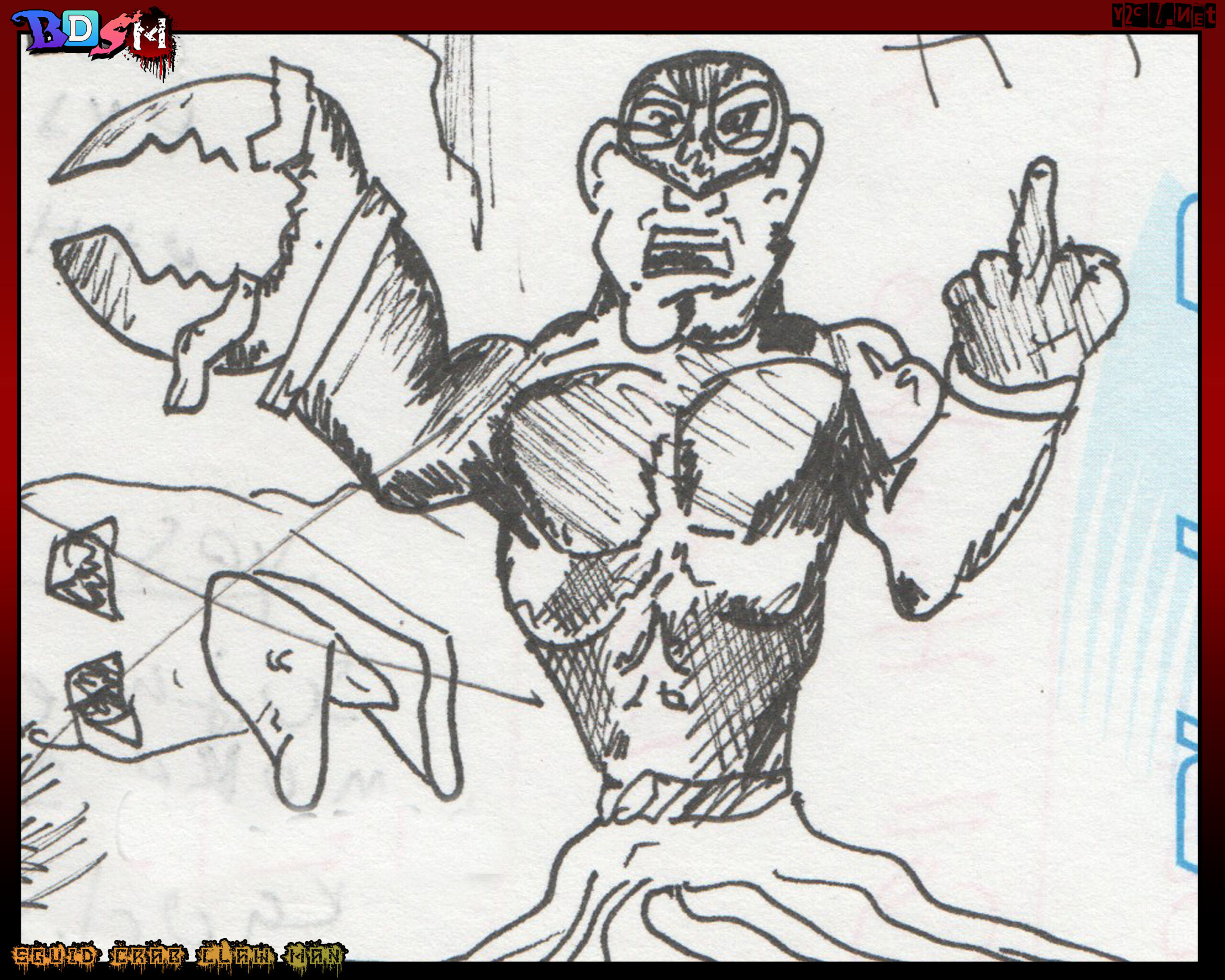 This was drawn on a Blue Line pro sketch pad they sent me. He is a failed super hero. If he could talk, he would say "Were are my legs? Ass"
