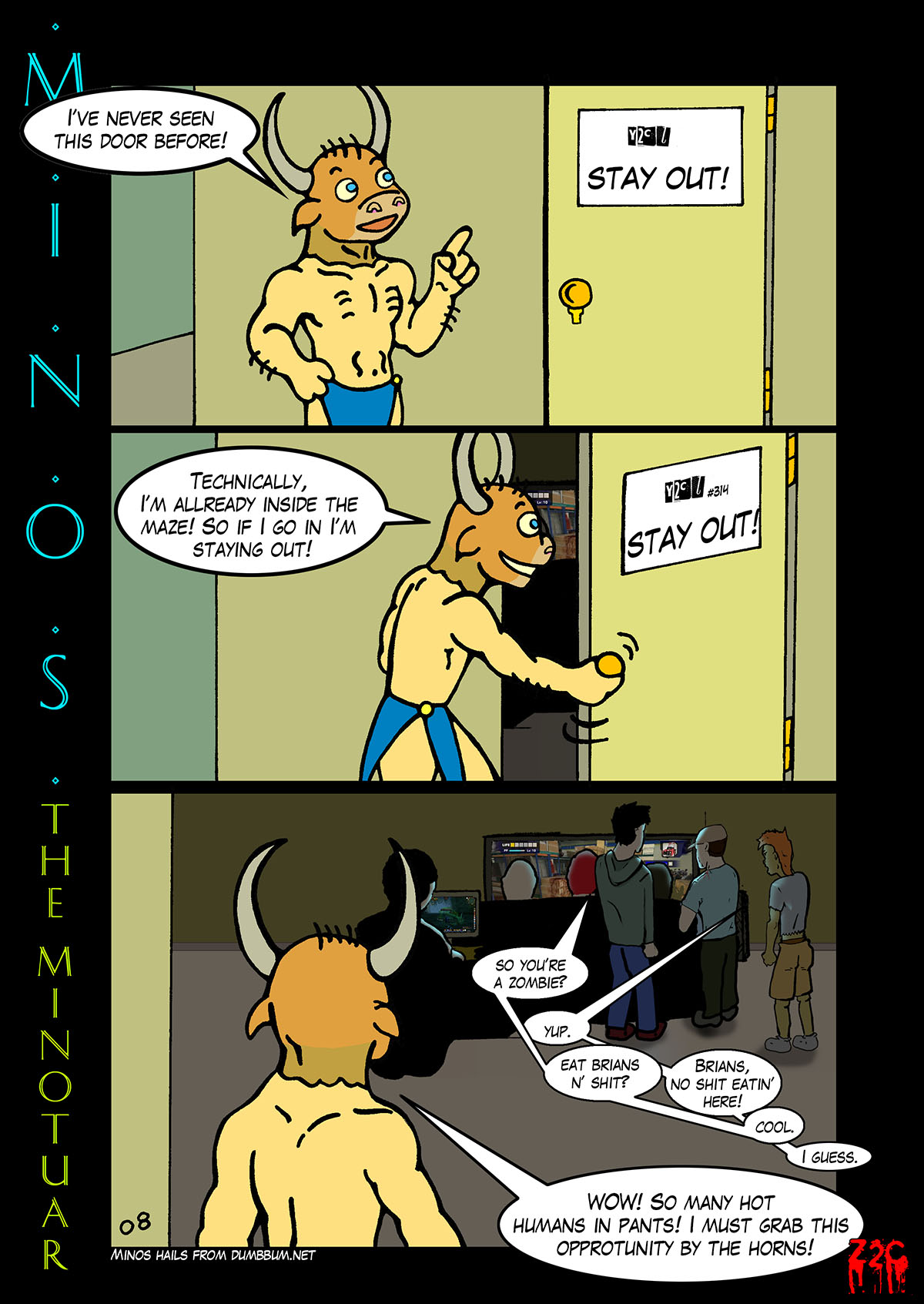 Minos in front of a door. Door sign says “y2cl#314 Stay out!”