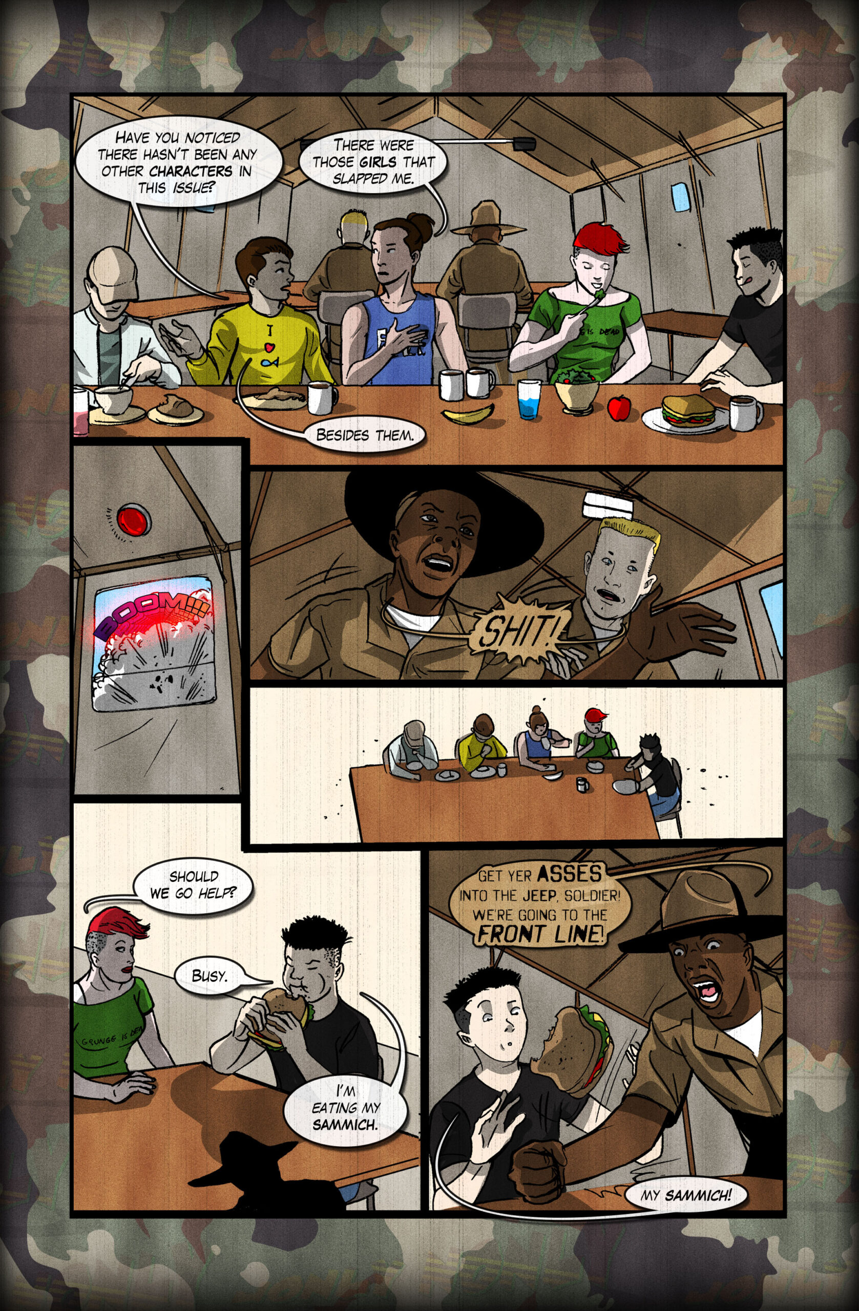 In the mess hall, this should look like a mess hall at a war base. A giant tent and dirty. Blinky and Awesome-Stance are at one table, the gang is at the rest. Everyone has a tray of food. The only one that matters on being specific is Jonly's needs to be a sandwhich.