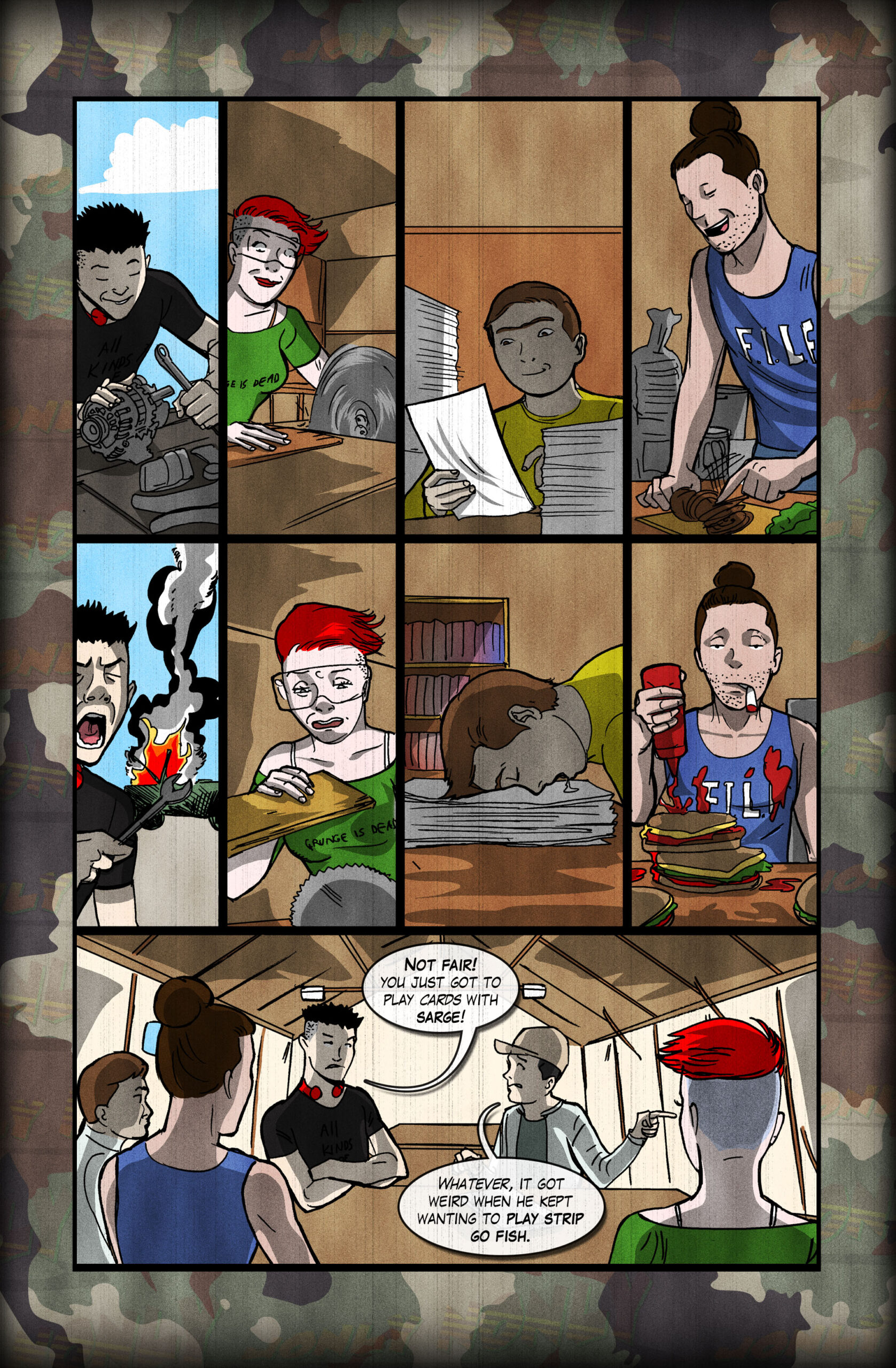 Rest of page. The gand is sitting at a table in the mess hall. Earf is pointing off to one side. On the table is a moleskin notebook by Earf