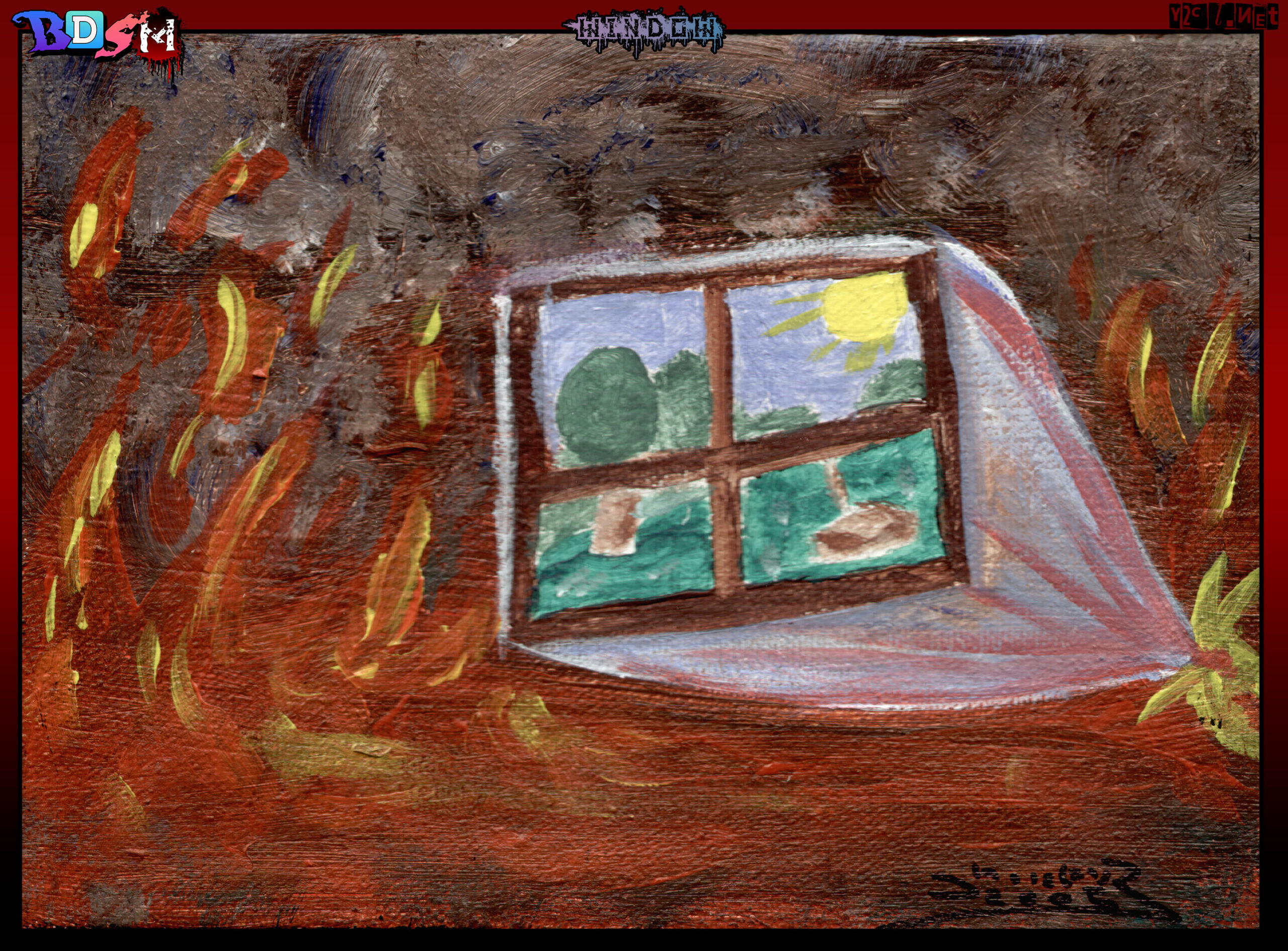 I painted this back in 2003 in response to a conversation with a friend about living in a fire but seeing the beauty outside you can't get to. It's more about mental struggle of being stuck in your head, knowing and seeing there's beauty you can see but you can't get yourself to go to it.