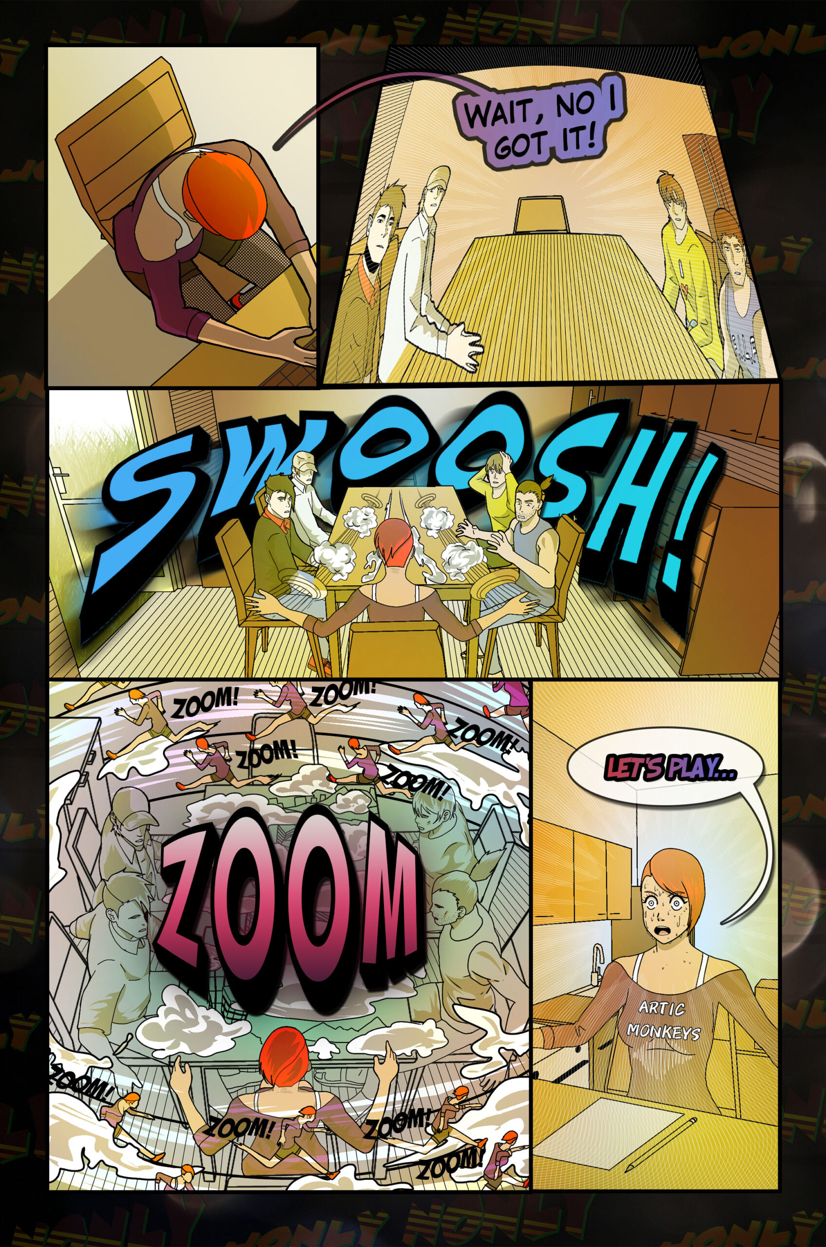 K-dizzle runs off panel, all the guys are looking her direction as she zooms off panel
